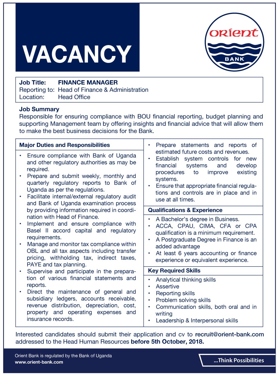 A manager needs to learn the language of numbers. Under the supervision of the country coordinator with technical reporting to the finance manager cwc and the pod manager cwc, the finance, human resource and administration manager's main responsibilities are: The position of finance manager usually requires an advanced degree in accounting, business, economics, or finance, as well as several years of experience in a finance role. The roles and responsibilities of a finance manager require a sincere commitment to detail and an inexhaustible need for new challenges. Each industry has its own laws and spending regulations, such as health care or local government, that finance managers must adhere to and, more importantly, hold each department of the business accountable for in order to maintain a fully functioning and. Assessing staff performance and provide coaching and guidance to ensure maximum efficiency. Developing, reviewing, and improving administrative systems, policies, and procedures. Minimum of bachelor's degree in business administration, accounting or related field; Advanced degree in accounting, finance or business administration. This job description assumes the latter view of the finance manager position. However, many of these risks can be reduced by purchasing insurance or by hedging. The finance and admin officer has responsibility for the implementation of general finance functions for the pmu. Ensuring the office is stocked with.